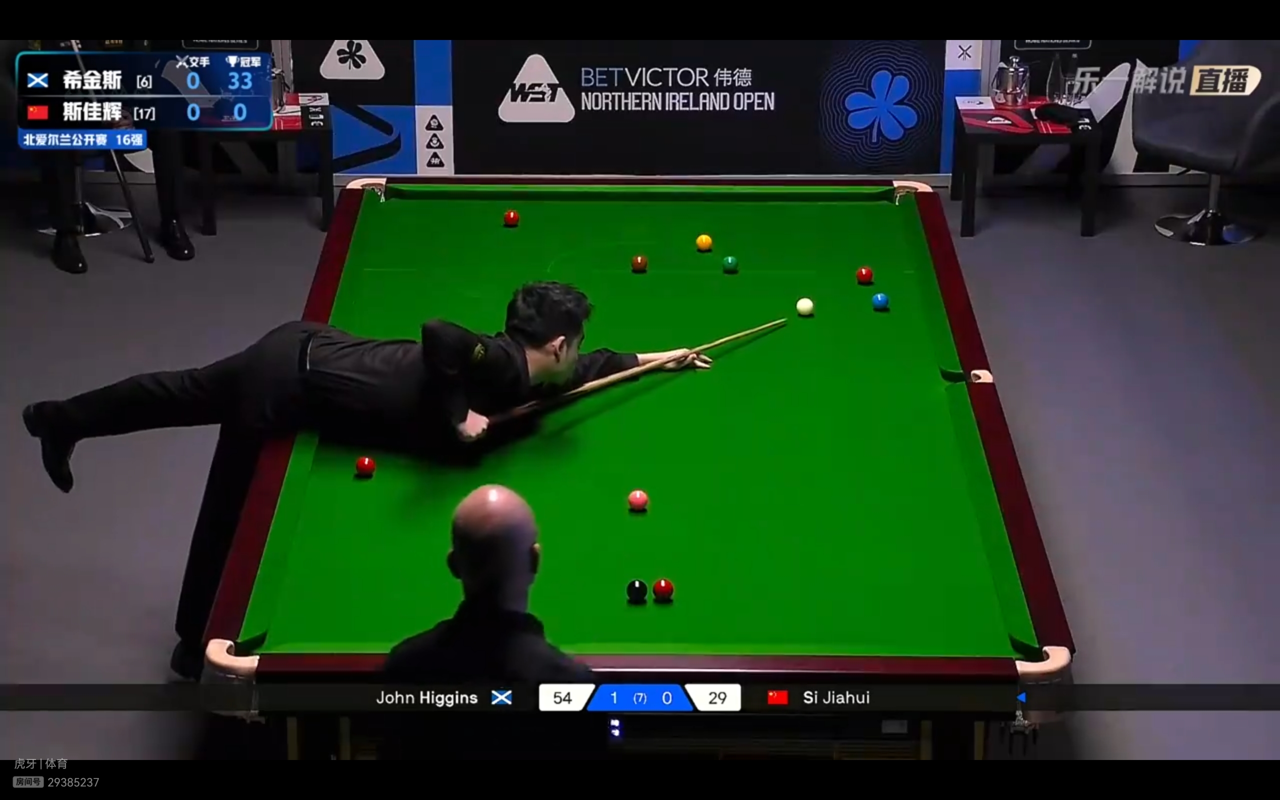 This match follows a best-of-seven frames format, and currently the players are competing in the first frame, with Si Jiahui behind Higgins 29-54 in points.