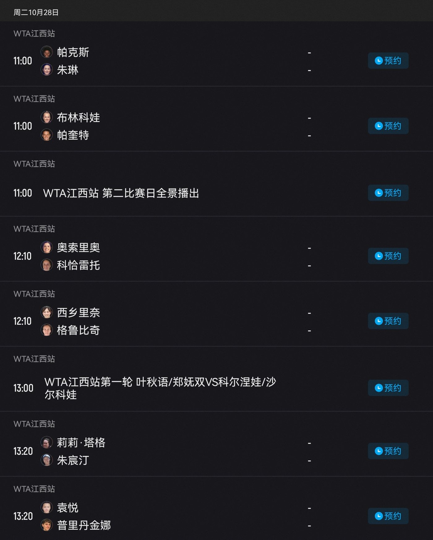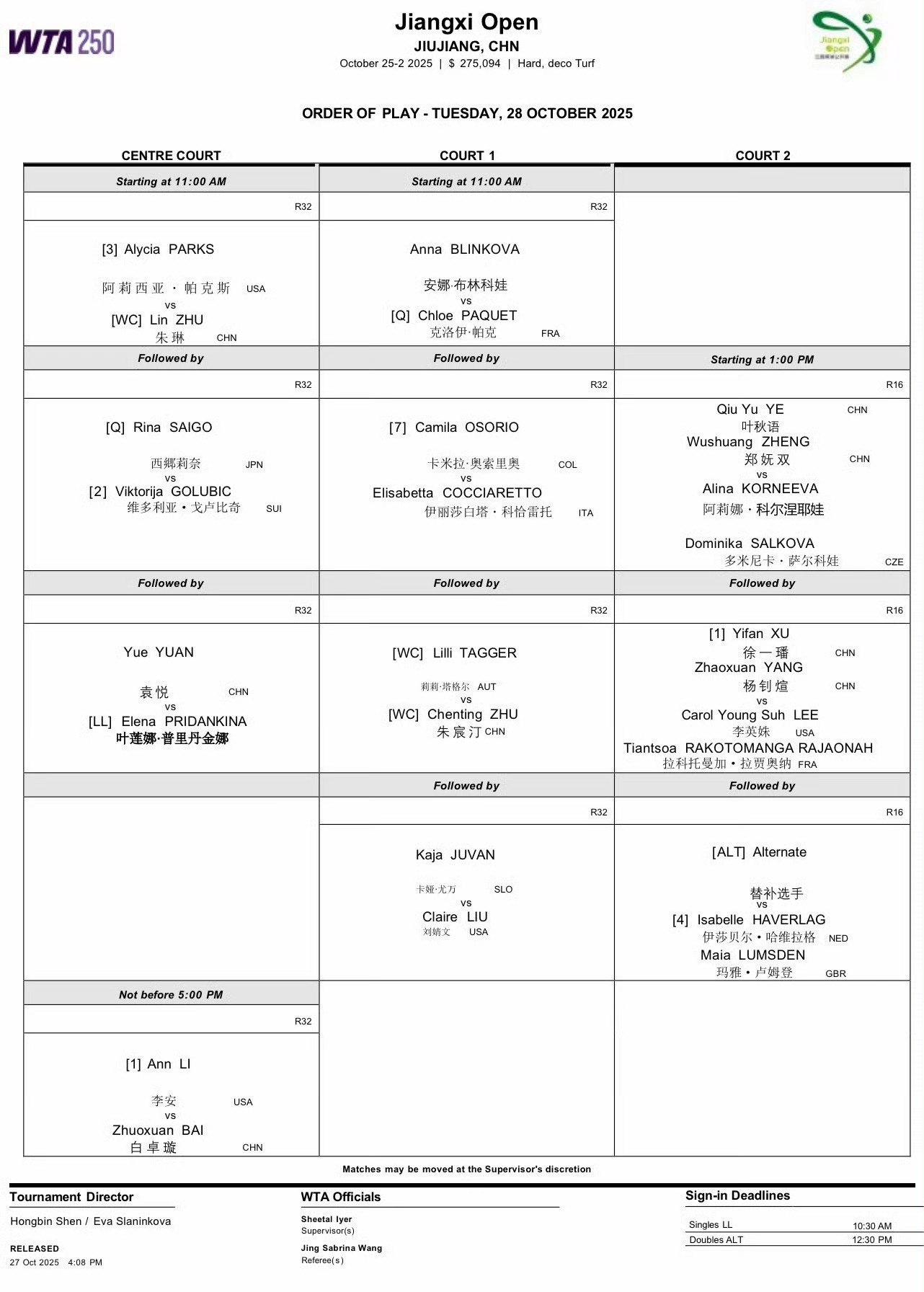Tomorrow’s (October 28, 2025) WTA250 Jiangxi schedule features Chinese players Yuan Yue and Zhu Lin competing, with live streaming on Youku.