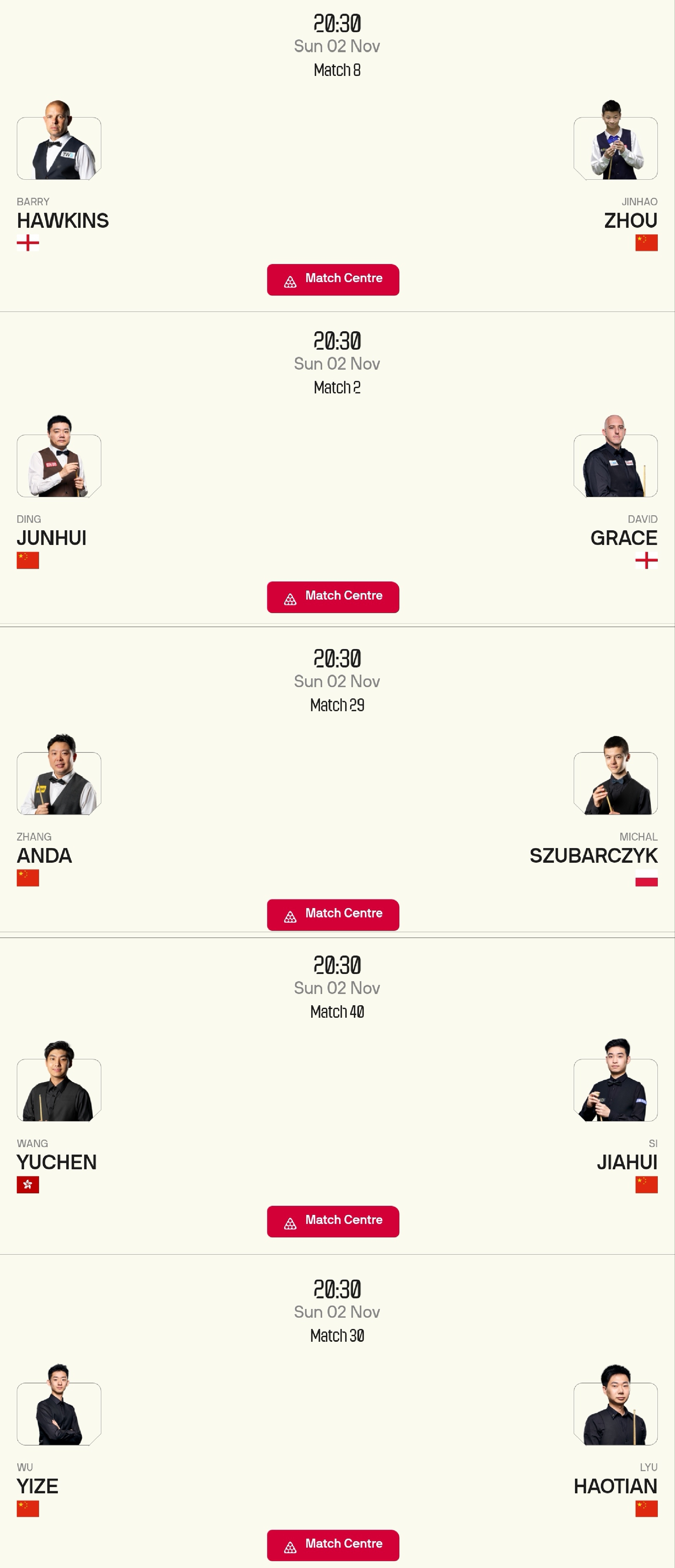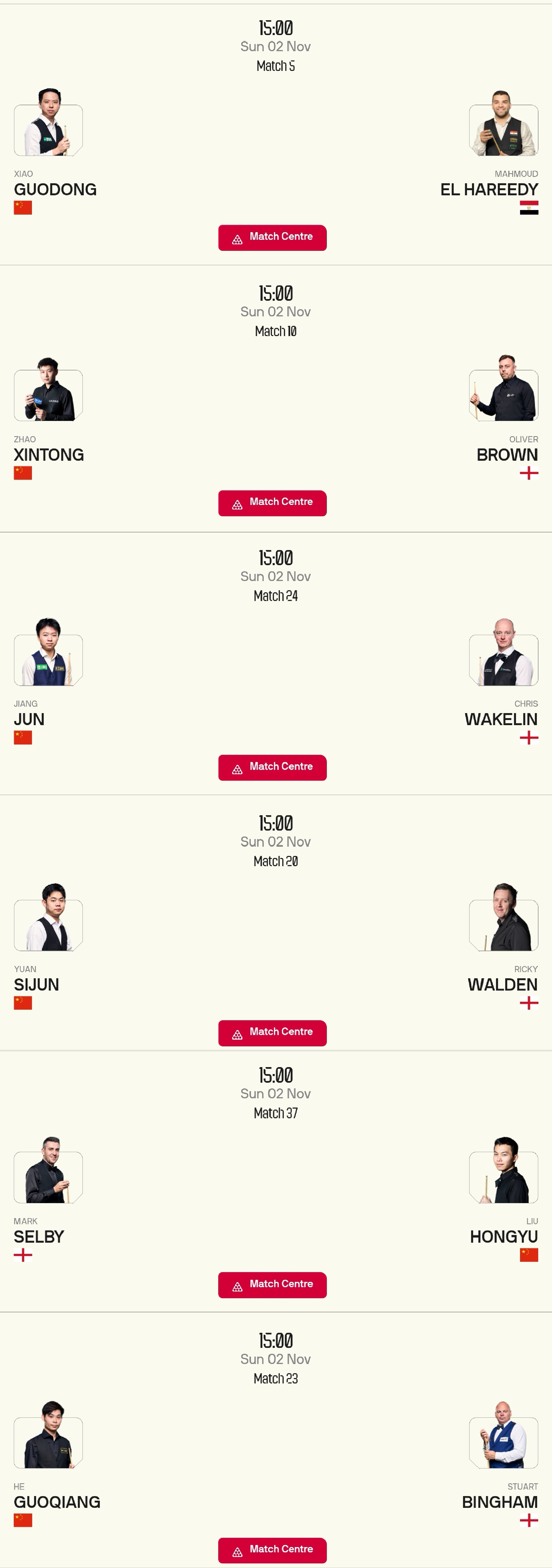 2. This Sunday (2025.11.2) at 3:00 PM,Six players including Xiao Guodong, Zhao Xintong, Jiang Jun, Yuan Sijun, Liu Hongyu, and He Guoqiang will compete. Xiao Guodong and Zhao Xintong are likely to win comfortably, Yuan Sijun is expected to beat Walden. Jiang Jun will play Wakelin, Liu Hongyu faces Selby, and He Guoqiang meets Bingham; these three players are generally expected to be eliminated in the first round unless there is an upset!