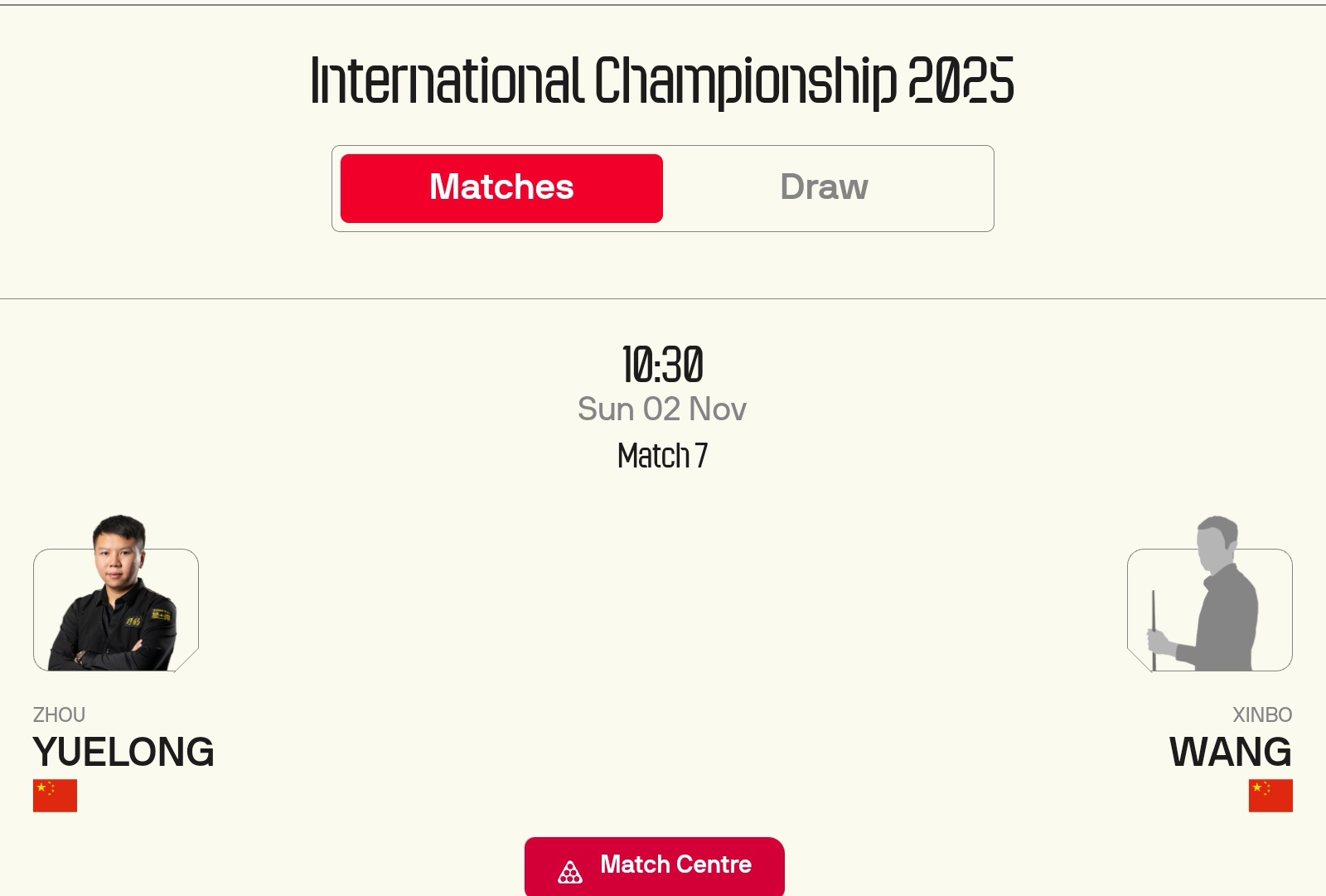 This Sunday (2025.11.2) at 10:30 AM,Zhou Yuelong faces Wang Xinbo. Under normal circumstances, Zhou Yuelong is expected to win and advance to the next round.