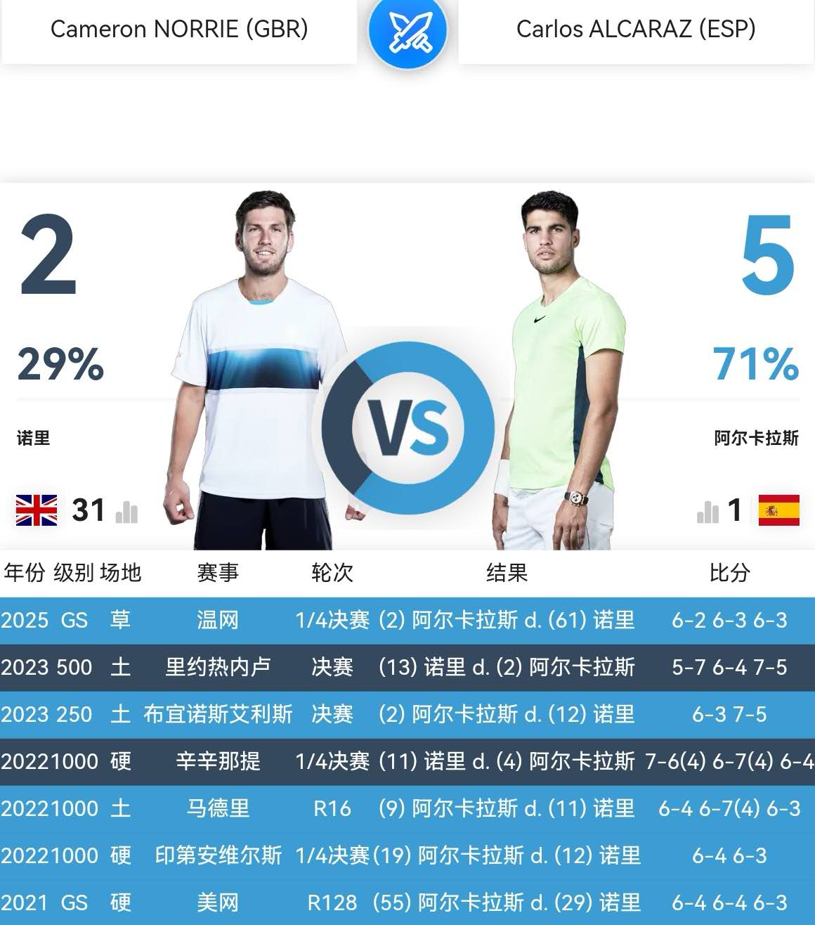 Since 2023, with advancing age and injuries, Norrie’s form has fluctuated and results declined, with his ranking hovering around 30. Throughout his career, Norrie has faced Alcaraz seven times, winning twice and losing five. Compared to other top-ranked players, this record is quite respectable, showing that Norrie still possesses the skill and tactical ability to challenge anyone and should not be taken lightly.