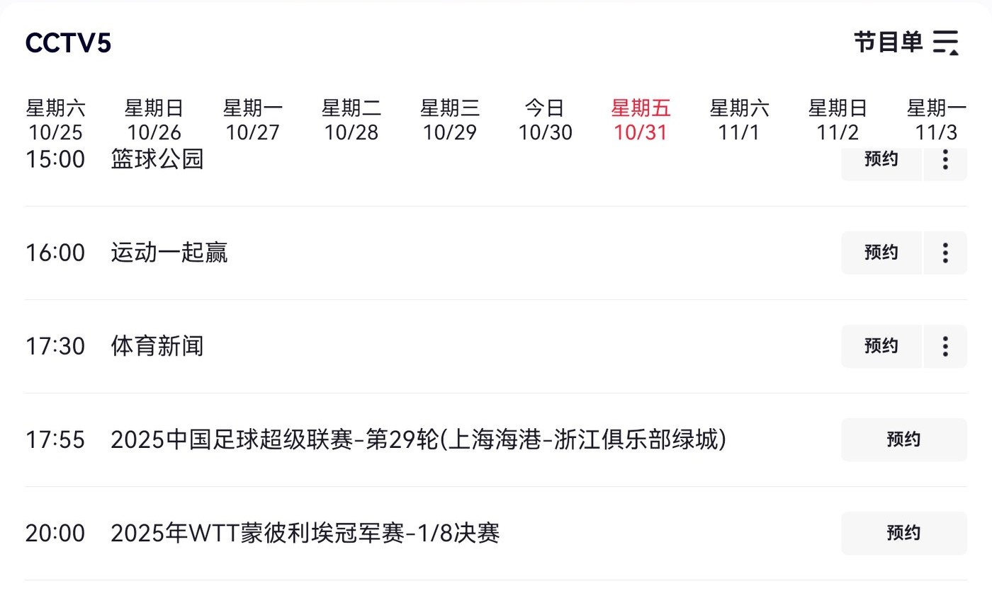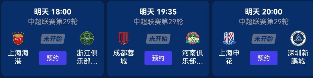 Tomorrow's (2025.10.31) Chinese Super League schedule features three matches with Shanghai Port, Chengdu Rongcheng, and Shanghai Shenhua participating, broadcast live on CCTV and Migu Video.