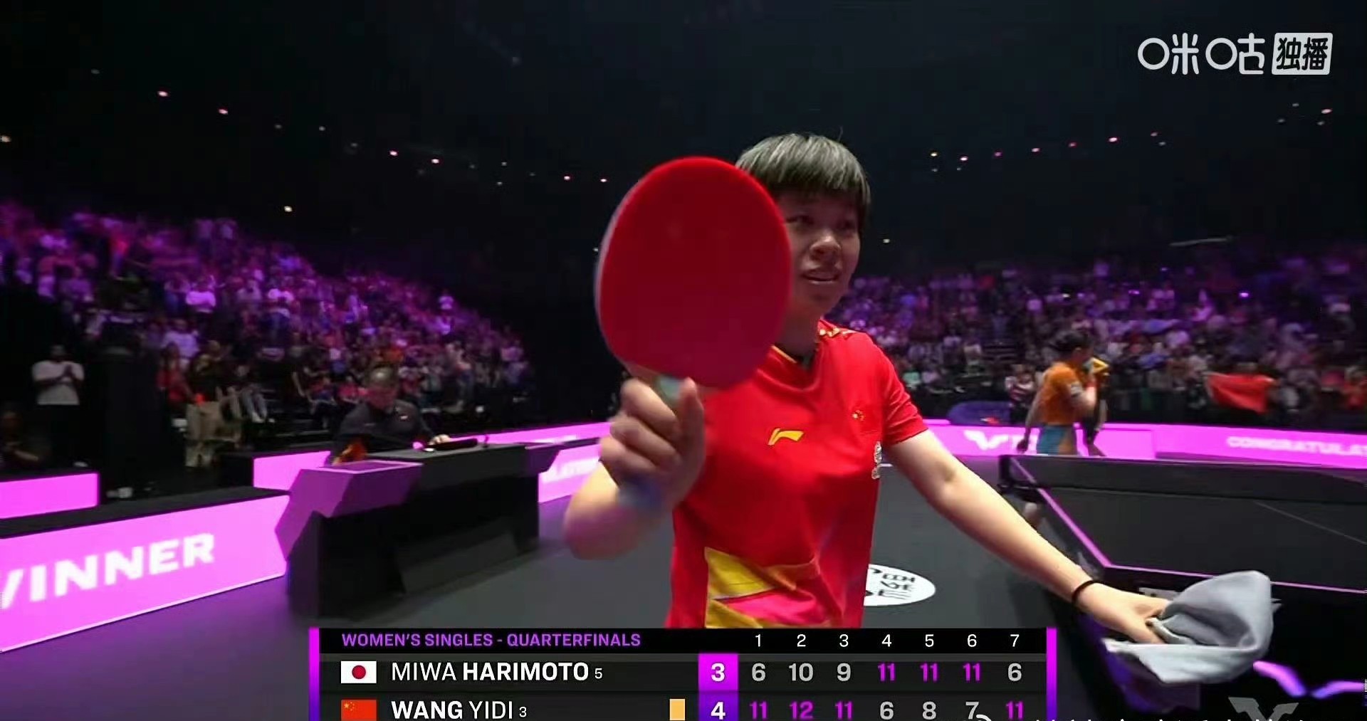 Wang Yidi beat her opponent Mima Ito 11-6, 12-10, 11-9, 6-11, 8-11, 7-11, 11-6, achieving a 4-3 overall victory to advance to the semifinals.