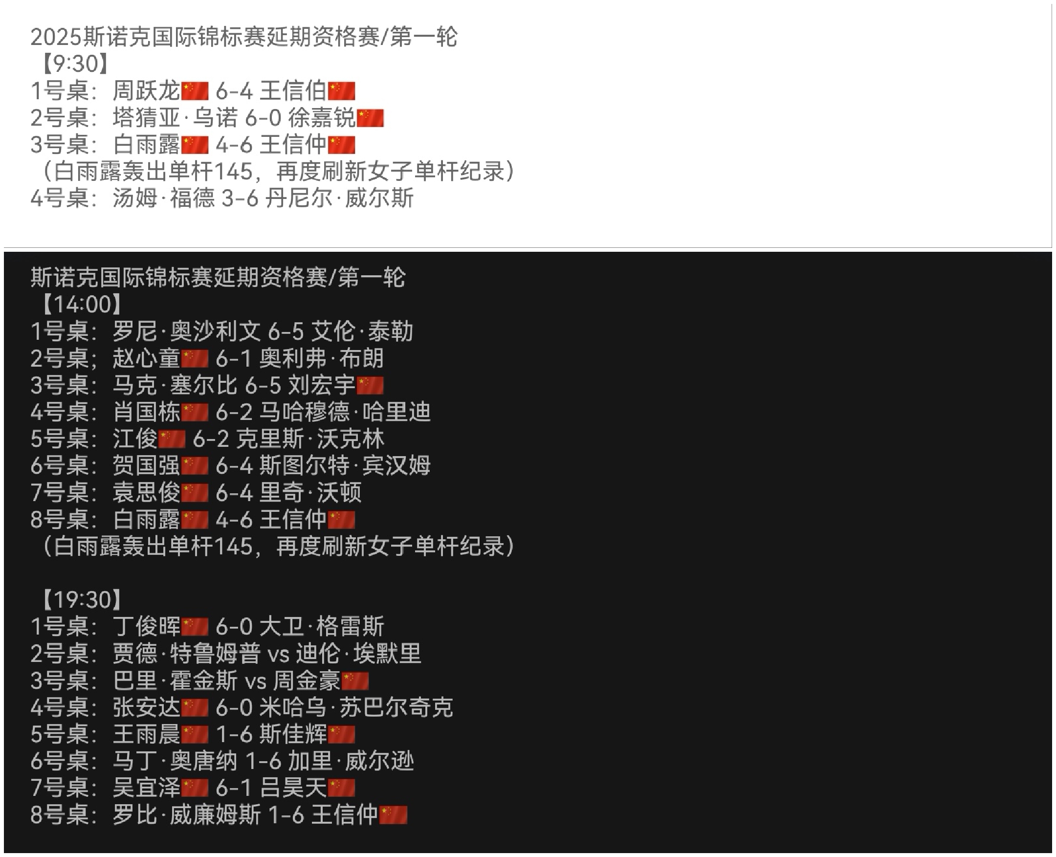 Detailed results of today’s matches for the Chinese players are shown in the image below.