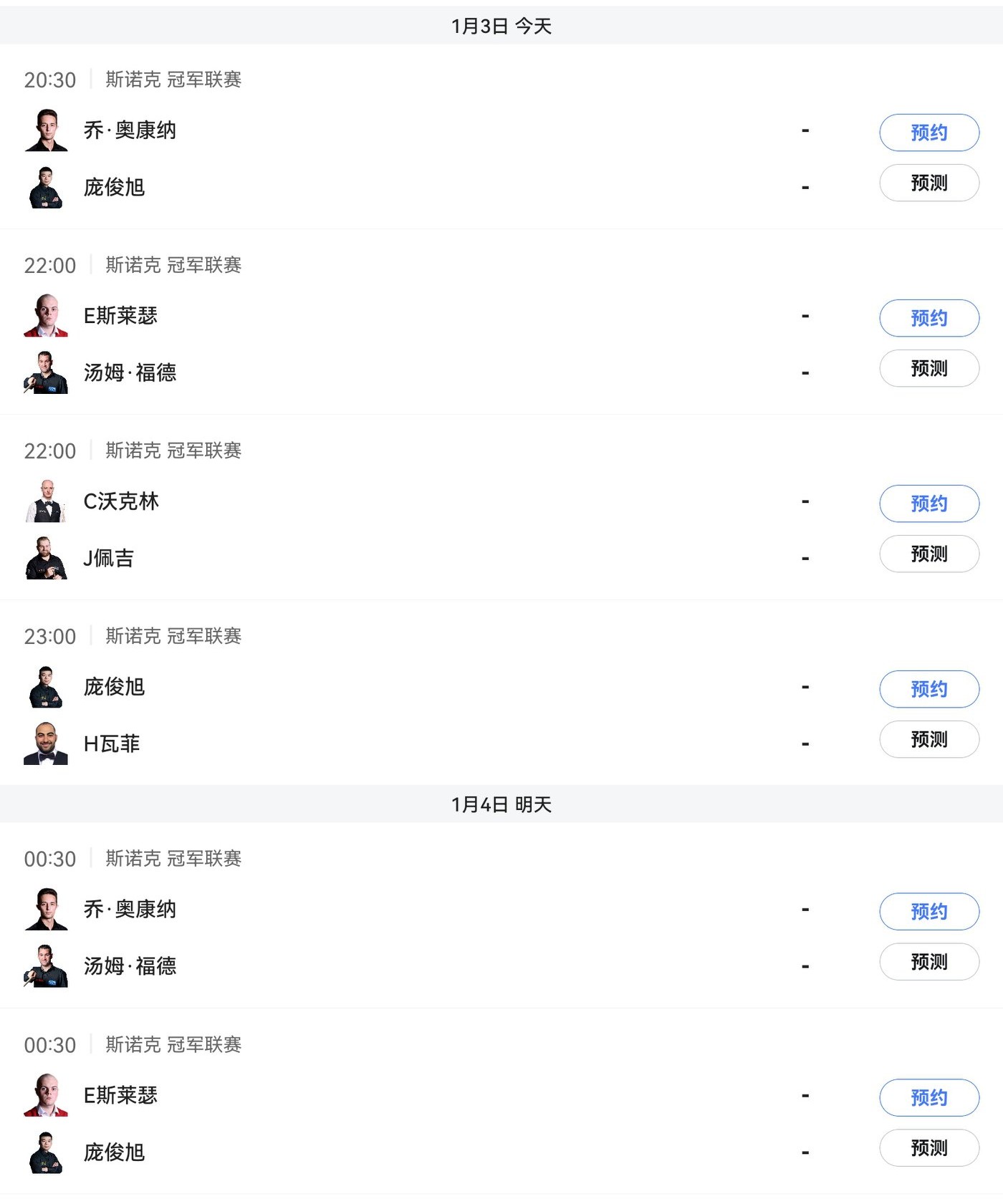The Snooker Champions League schedule for today (2026.1.3) includes three matches for Pang Junxu, broadcast live on Huya.
