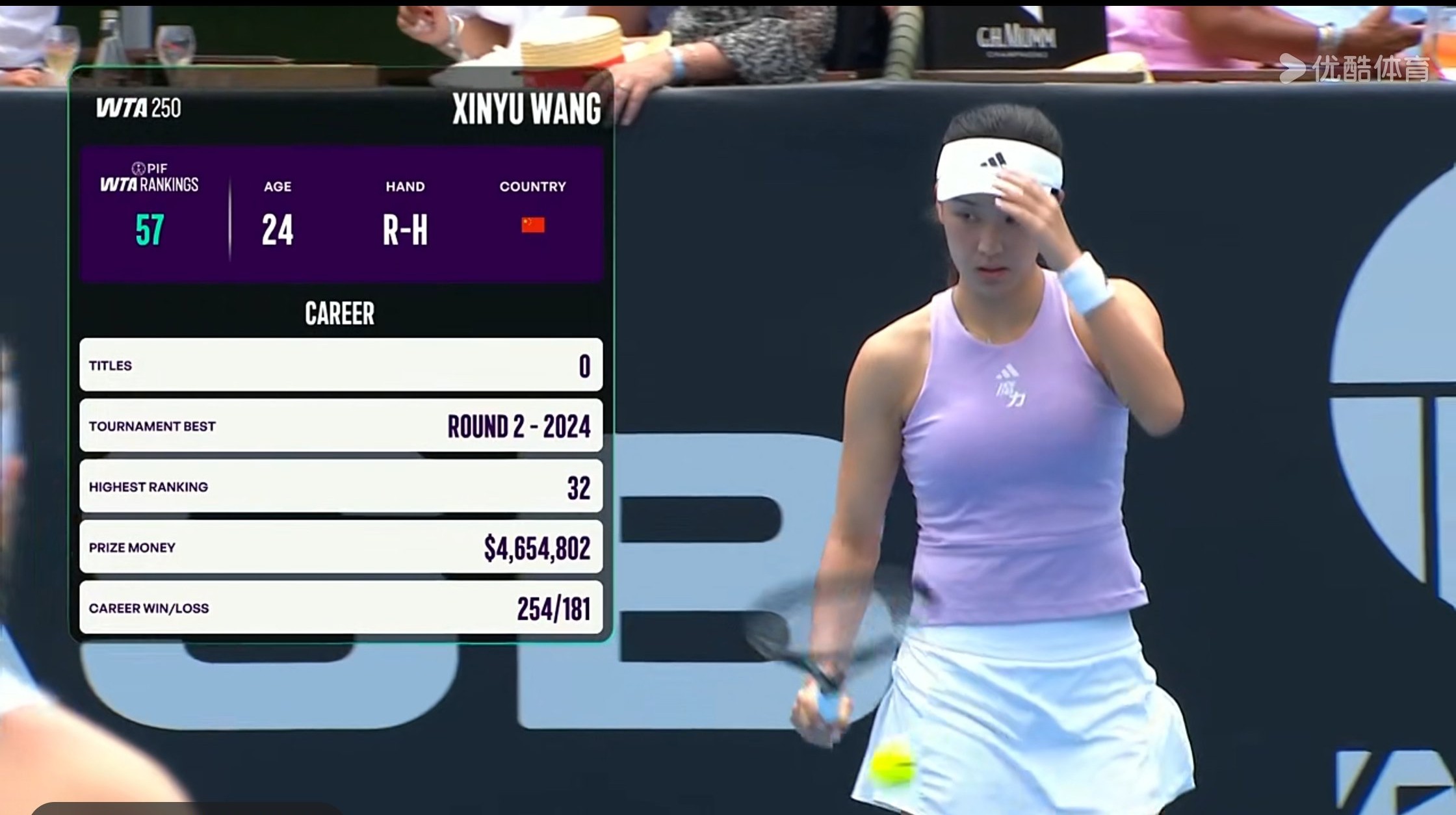 Youku Sports Channel is live streaming the WTA250 Auckland tournament match between Wang Xinyu and McNally.