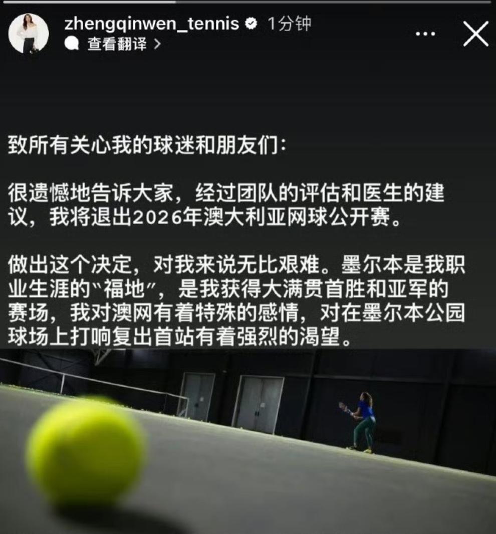 When Chinese players gradually announced their 2026 season plans, Zheng’s absence was notable, leading many to speculate that she was unlikely to participate in the 2026 Australian Open.