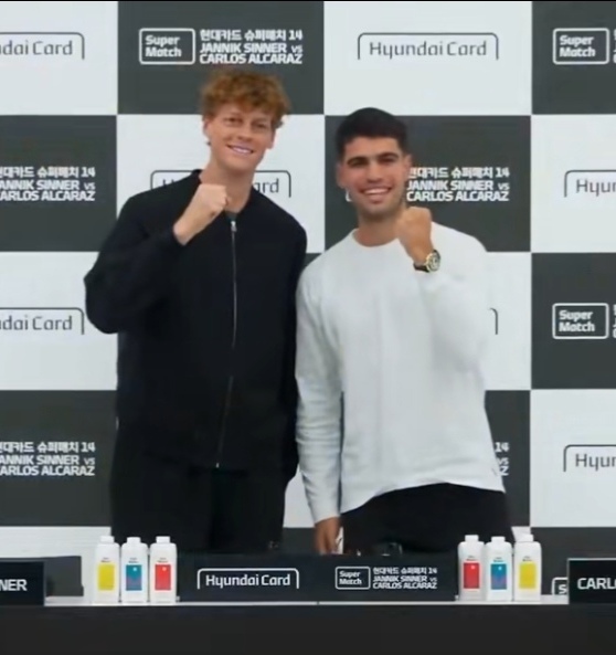 This idea from the two rising stars originated at a pre-match press conference before an exhibition in South Korea. Alcaraz took the initiative, Sinner responded enthusiastically, and they even discussed court positioning on the spot — Alcaraz covering forehand side, Sinner the backhand side.