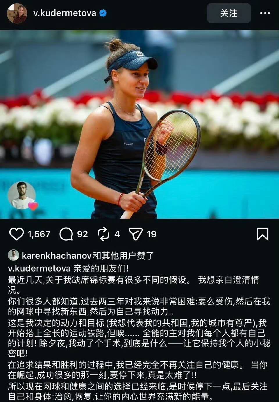 Turning to another important statement, Russian player V. Kudermetova explained to fans her recent absence from competitions.