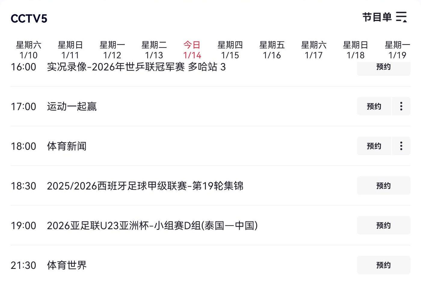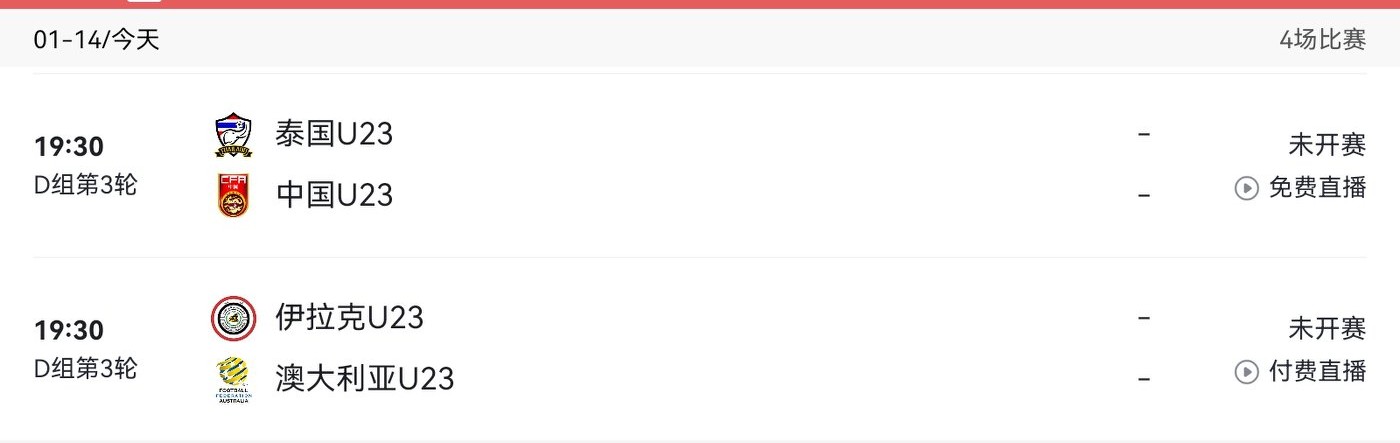 On today’s (2026.1.14) U23 Asian Cup schedule, China competes against Thailand, needing only a draw to advance, with live coverage on CCTV-5 and CCTVC Video.