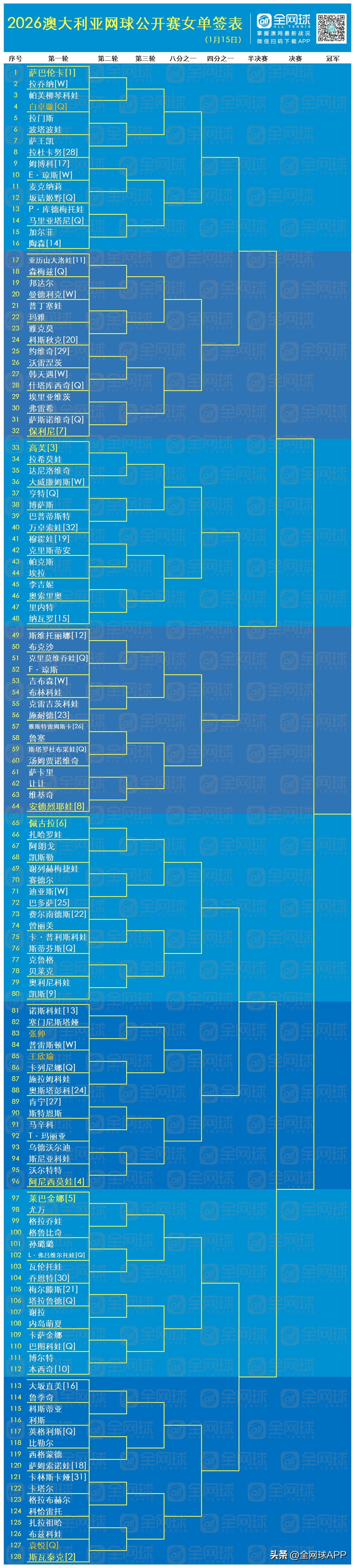 Complete 2026 Australian Open Men’s and Women’s Singles Draw in Chinese