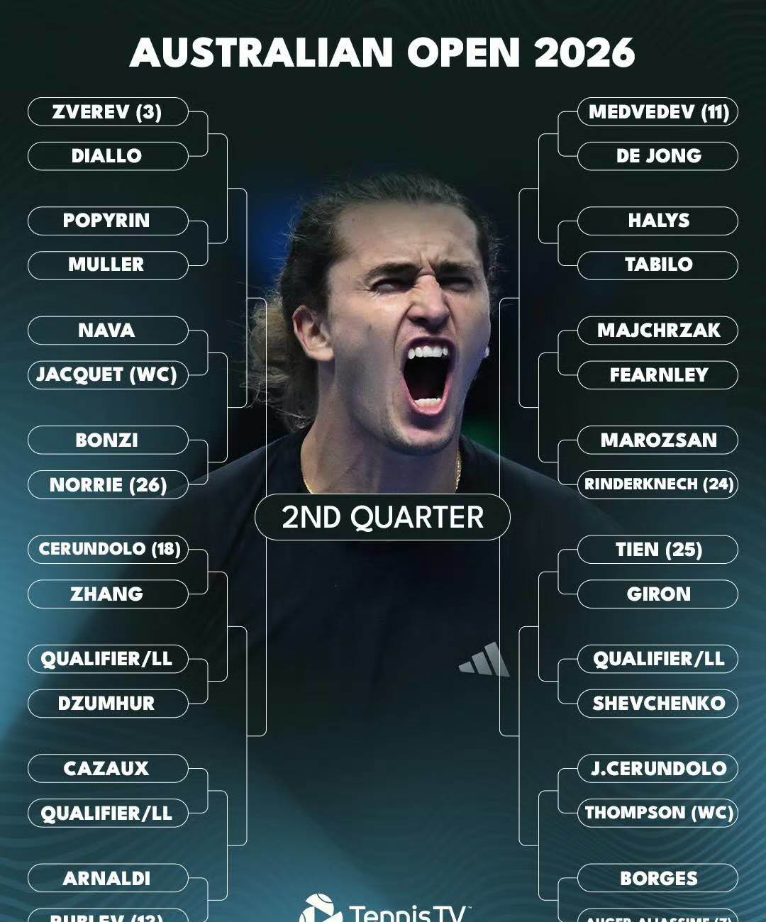 The second quarter is led by third seed Zverev, with other seeds including seventh seed Alcaraz, eleventh seed Medvedev, thirteenth seed Rublev, as well as Cerundolo, Lindgren, Norrie, and last season’s Australian Open breakout player Linner. Overall, the seeded players here are fairly evenly matched, making it a quarter where anyone could reach the semifinals.
