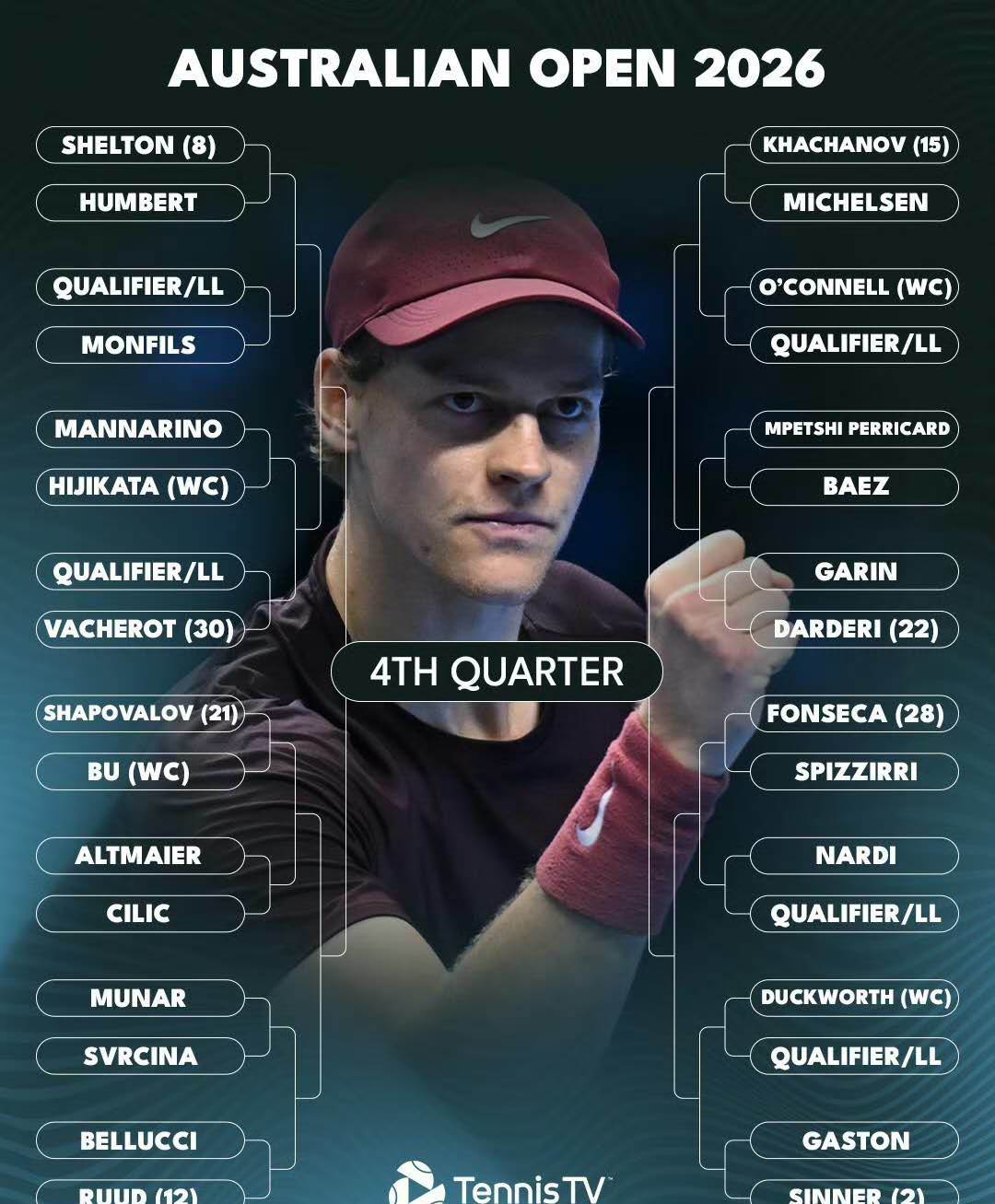 The final quarter is led by two-time defending champion Sinner, who will face the French left-handed powerhouse Gaston in the opening round. Other seeds in this section include Shelton, Ruud, Khachanov, Darderi, Vacherot, and Fonseca.
