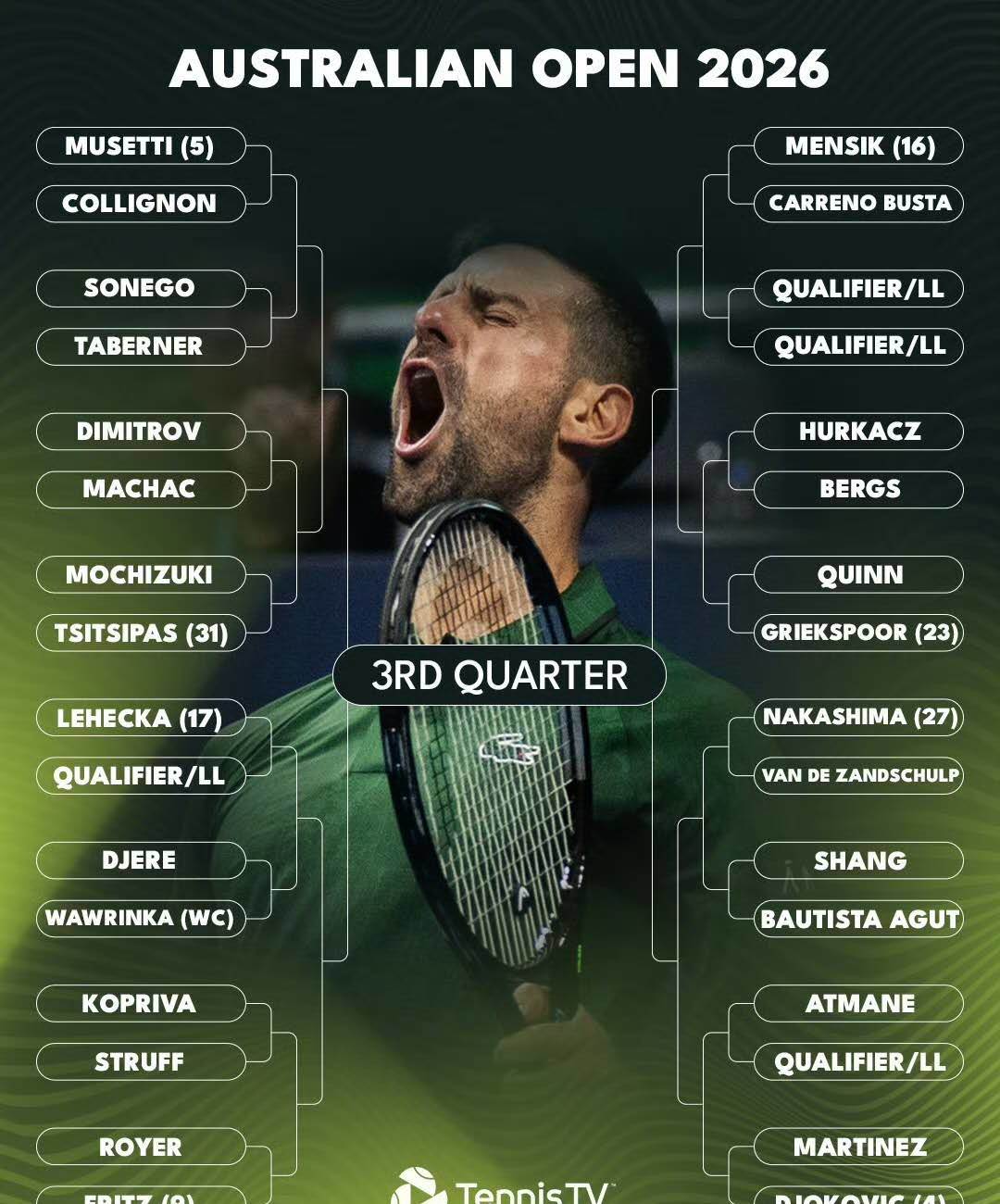 The third quarter is headed by ten-time champion Djokovic. Given the current strength of Alcaraz and Sinner, he will inevitably share a half with one of them. Other seeded players in this section include Fritz, Musetti, Menchik, Tsitsipas, Lehecka, Brandon Nakashima, and Griekspoor. Several of these players have been longtime rivals of Djokovic, so it can be considered a favorable draw for him.