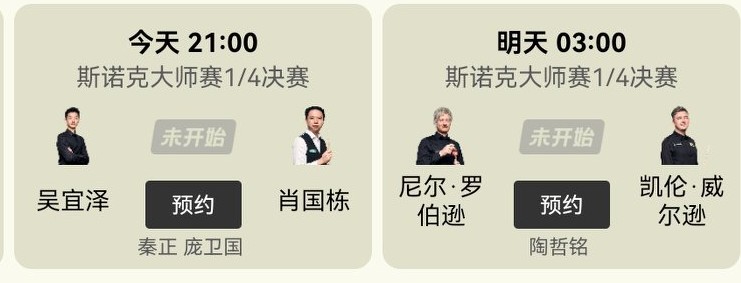 The Snooker Masters matches today (2026.1.16) include Wu Yize vs. Xiao Guodong and Neil Robertson vs. Kyren Wilson, with live coverage on CCTV-5, Yangshipin, and Huya.