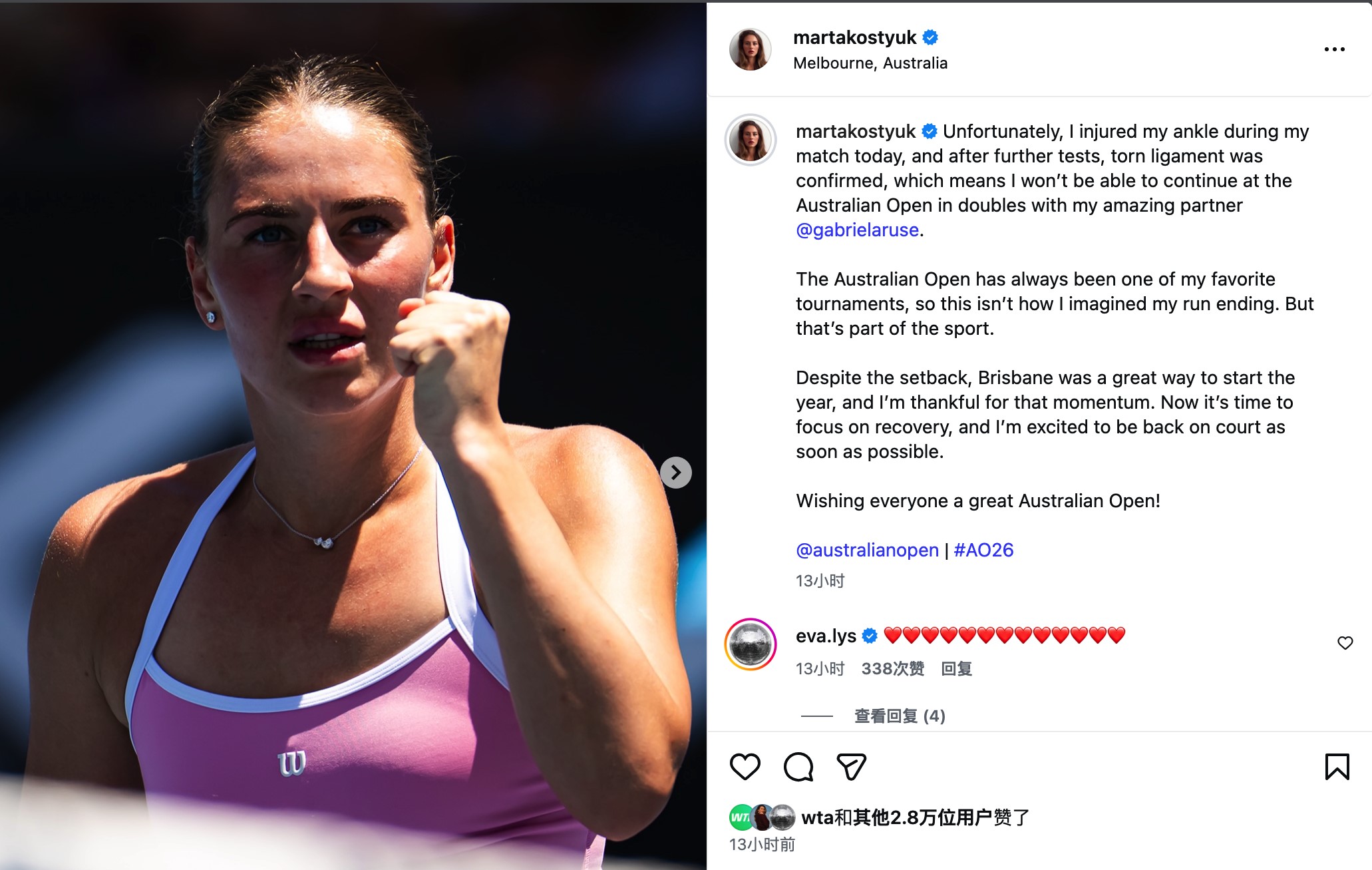 After the Brisbane final, Kostyuk arrived at Melbourne Park confident from defeating multiple top-ten players, ready for her seventh Australian Open main draw appearance. However, the fall in the penultimate game changed everything: not only did she lose the match, but she was diagnosed with a ligament tear that will require a lengthy recovery. Her team posted on social media: “Marta will focus on rehabilitation, and we will fully support her return to the court as soon as possible.” This accident serves as a stark warning to all professionals: finding the delicate and crucial balance between peak performance and physical health is essential.(Source: Tennis Home, Author: Xiao Di)