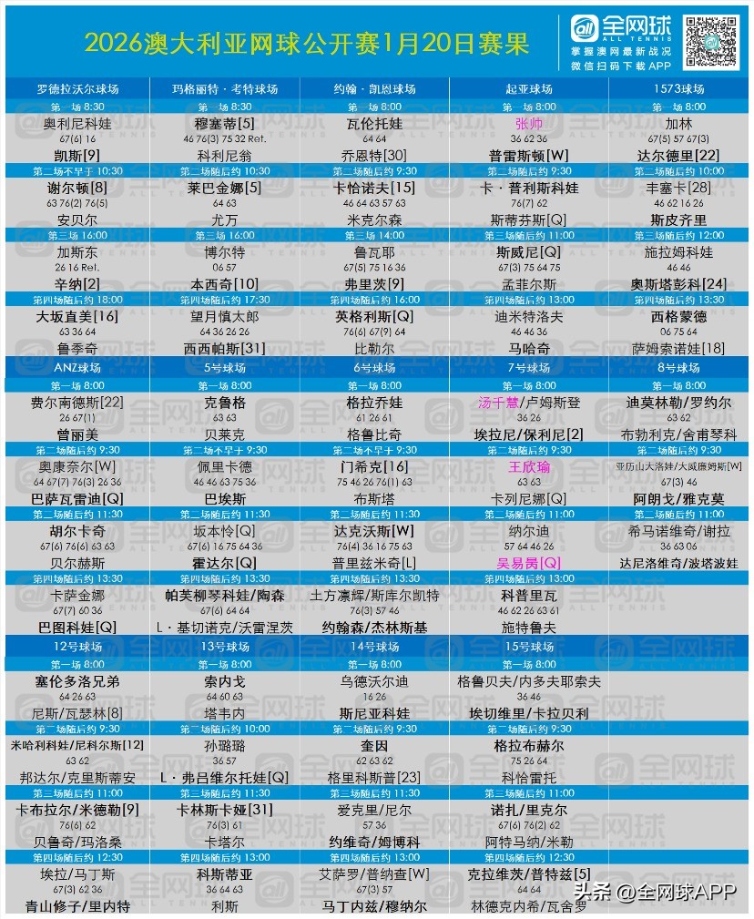 On January 20th, the third day of the 2026 Australian Open unfolded, concluding the first round of both men's and women's singles. Among the three Chinese players competing today, two secured victories while one suffered defeat: Wang Xinyu defeated qualifier Kalinina in straight sets and will face 24th seed Ostapenko; Wu Yibing overcame Italian Nardi in four sets and is set to play Spizzirri; Zhang Shuai fought hard but lost in three sets to local wildcard Preston.