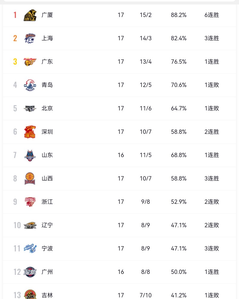 Currently, Zhejiang Fangxingdu holds a 15-2 record, ranking first in the league with strong performance.