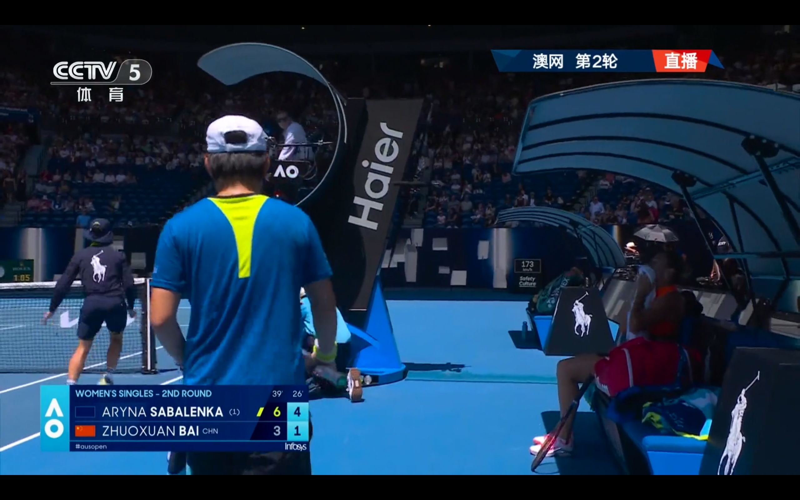 CCTV-5 and Yangshipin are currently airing the Australian Open women's singles second-round match featuring Bai Zhuoxuan against Sabalenka.