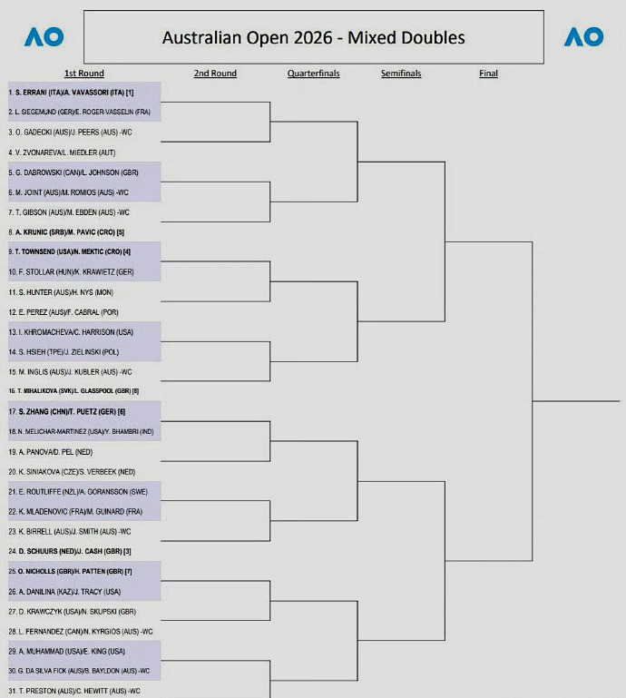 Additionally, last night Beijing time, the Australian Open released the mixed doubles draw. Chinese veteran Zhang Shuai teamed up with German Puetz to compete, facing Melichar and Bambri in the first round.