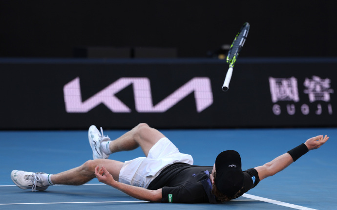 Finally, let’s guess and recognize. The image below shows an Australian Open qualifier collapsing in celebration after a victory over a veteran star who plans to retire this season. Can you identify who he is?