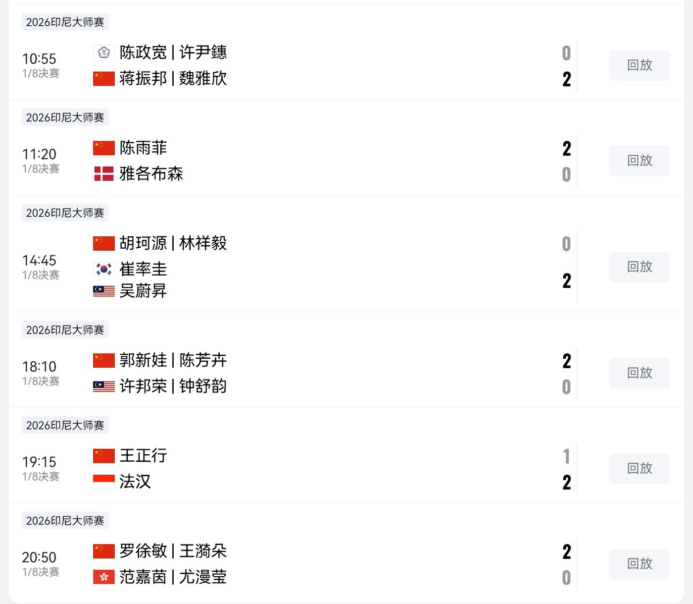 The detailed match results of Chinese players from today’s competition are shown in the image below.