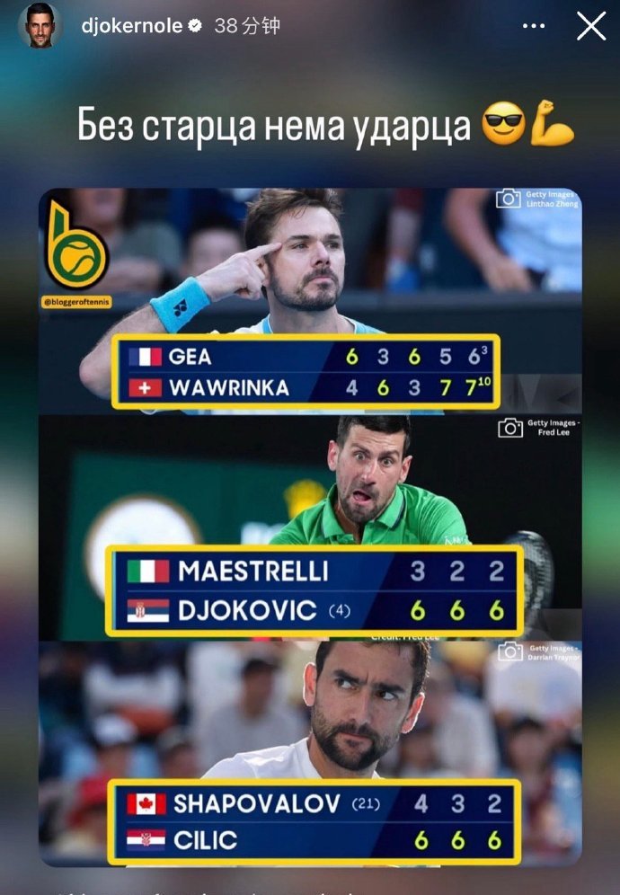 Other matches: Two-time defending champion Sinner crushed local player Duckworth 6-1, 6-4, 6-2; ten-time Grand Slam winner Djokovic defeated Italian qualifier Maestrelli 6-3, 6-2, 6-2. Post-match, Djokovic shared updates on social media about battles with fellow veterans Wawrinka and Cilic, both born in the mid-1980s. Wawrinka edged French qualifier Giraud in a deciding-set tiebreak, while Cilic swept Canadian star Shapovalov in three sets. Fritz, Mahut, Quinn, Musetti, Shelton, Ruud, and others also secured wins to reach round three.