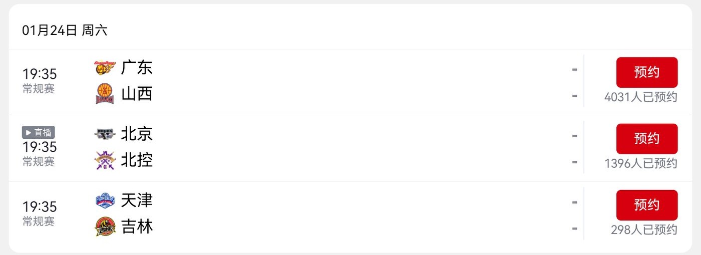 CBA schedule for tomorrow (2026.1.24): Beijing Derby between Beijing Beiqi and Beijing Enterprises, live on CCTV-5.