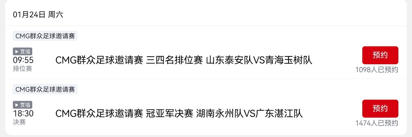 The CMG Community Invitational schedule for tomorrow (2026.1.24) features the gold medal match Yongzhou, Hunan vs. Zhanjiang, Guangdong, and the bronze medal match Taian, Shandong vs. Yushu, Qinghai, broadcast live on CCTV-5 and Yangshipin.
