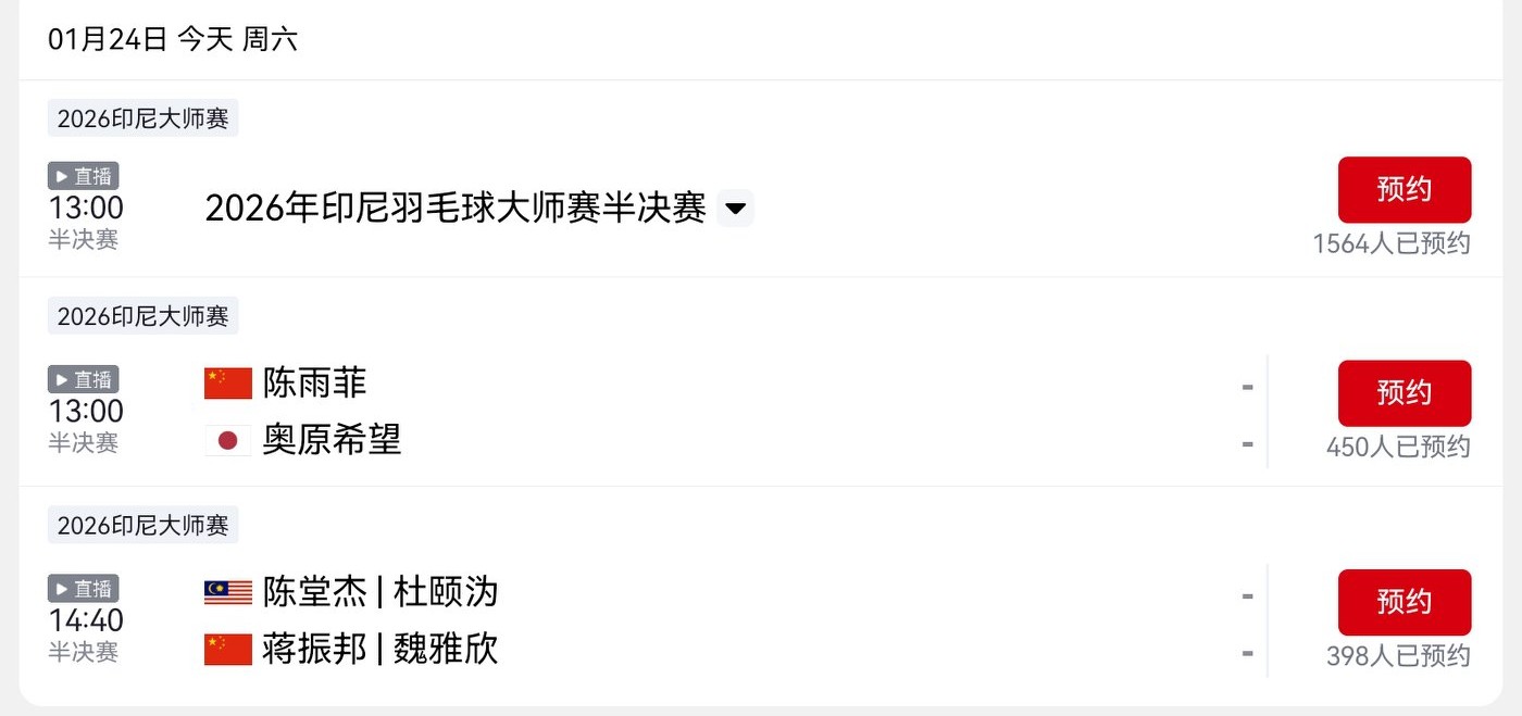 Today’s schedule for the Indonesia Masters Badminton Tournament (2026.1.24) includes Chen Yufei among the competitors, with live coverage on Yangshipin and Youku.