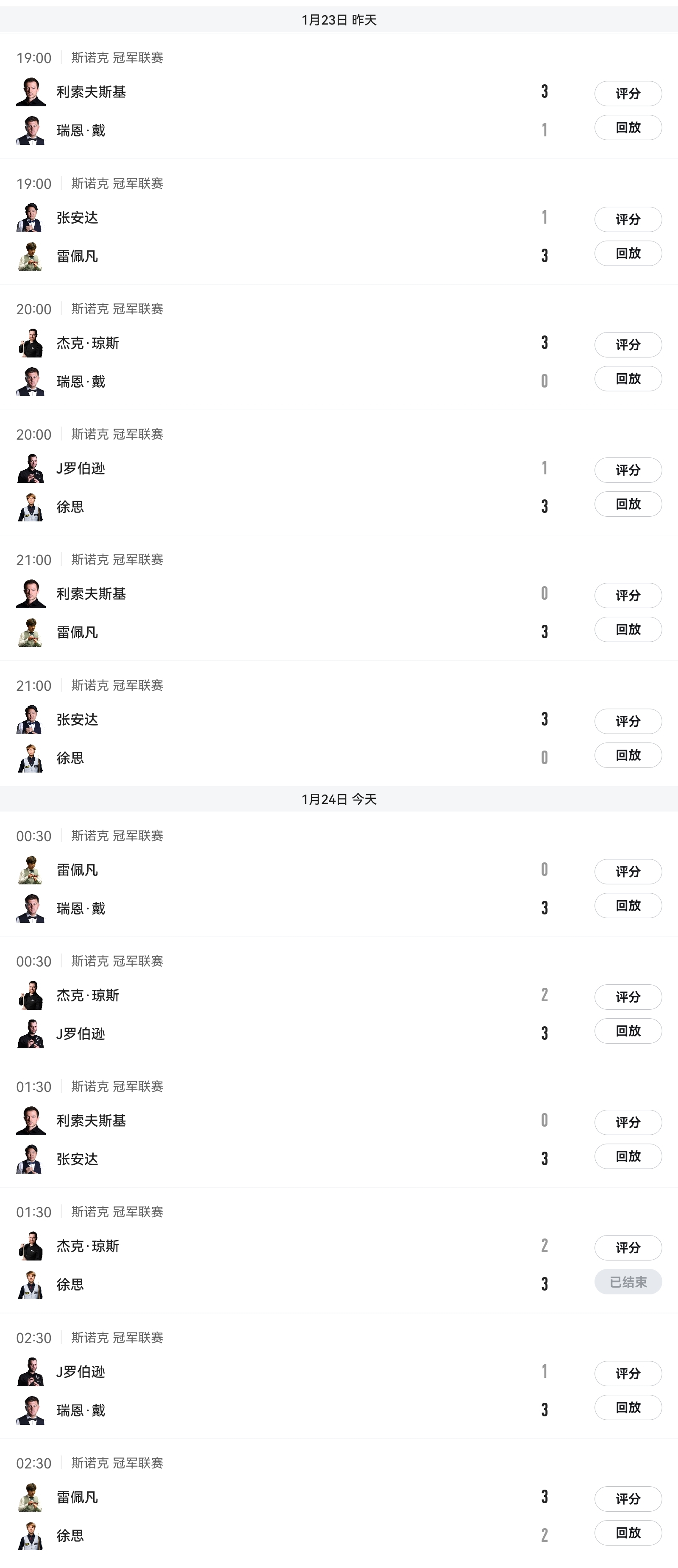 Lei Peifan’s 3 wins and 1 loss: Lei Peifan defeated Zhang Anda 3-1, beat Lisowski 3-0, lost to Ryan Day 0-3, and won against Xu Si 3-2.