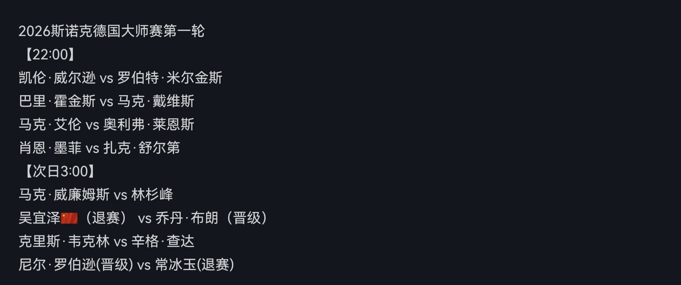 The Snooker German Masters matches tomorrow (2026.1.26) include the withdrawals of Wu Yize and Chang Bingyu, while Kyren Wilson, Mark Allen, Mark Williams, and Shaun Murphy will participate. Zhao Xintong will compete the day after tomorrow, with live streams on Migu Video and Huya.