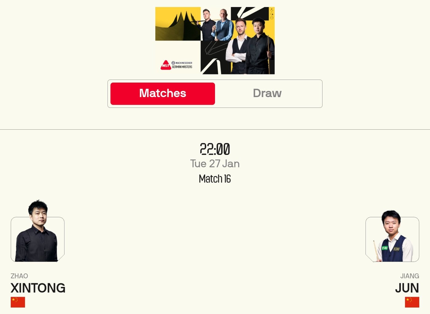 Additionally, the highly anticipated Zhao Xintong will also compete in the German Masters. According to the official schedule from the Snooker website, on January 27, 2026, at 10 PM Beijing time, Zhao Xintong will face Jiang Jun. This match will be broadcast live on Huya and Migu Video. Everyone is welcome to watch.