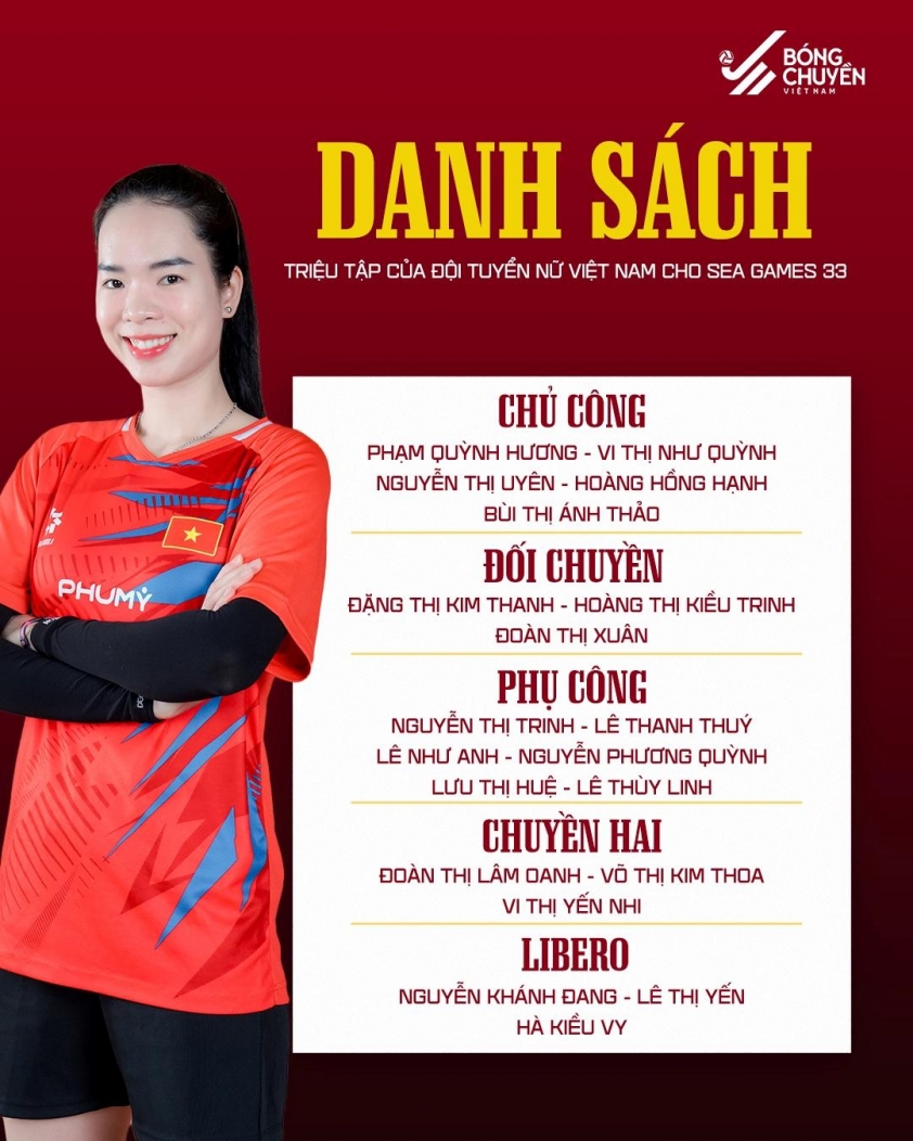Accordingly, the call-up list includes athletes such as: Pham Quynh Huong, Vi Thi Nhu Quynh, Nguyen Thi Uyen, Bui Thi Anh Thao, Hoang Hong Hanh (outside hitter), Dang Thi Kim Thanh, Hoang Thi Kieu Trinh, Doan Thi Xuan (setter), Nguyen Thi Trinh, Le Thanh Thuy, Le Nhu Anh, Nguyen Phuong Quynh, Luu Thi Hue, Le Thuy Linh (middle blockers), along with setters like Doan Thi Lam Oanh, Vo Thi Kim Thoa, Vi Thi Yen Nhi. The libero pair consists of Nguyen Khanh Dang and Ha Kieu Vy.