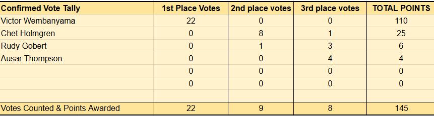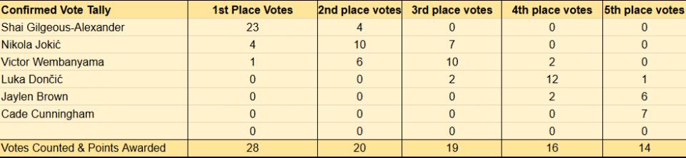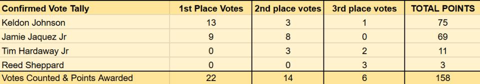 The competition for Sixth Man of the Year is expected to be between Keldon Johnson and Jaime Jaquez Jr. Among the 22 voters who have revealed their votes so far, Johnson received 13 first-place votes and Jaquez received 9 first-place votes, with only a 6-point difference when their votes are converted to points.
