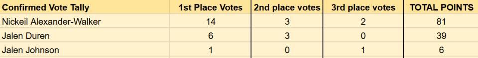 For the Most Improved Player, Alexander-Walker currently holds the advantage. In the published votes of 21 people, 14 placed him in the first-place position,领先 Duren by a比较明显的 margin.