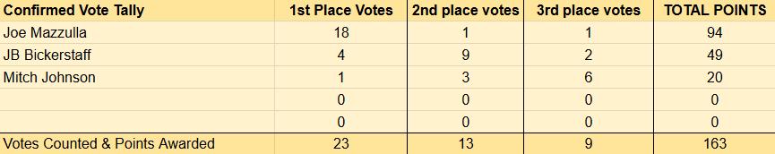 Regarding the Coach of the Year, Mazzulla has a clear advantage. Among the 23 voters who have revealed their votes, Mazzulla received 18 first-place votes, Bickerstaff received 4, and Mitch Johnson received 1. Although Bickerstaff has already won the Coach Association's Coach of the Year award, the NBA's official Coach of the Year award is expected to go to Mazzulla.