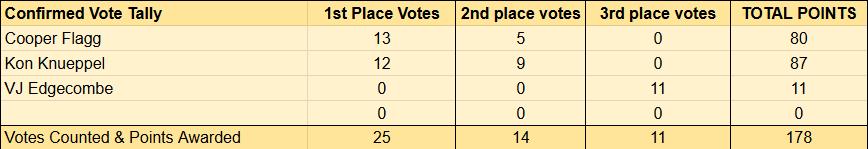 The competition for Rookie of the Year is intense. Edgecombe is重在参与, with the main contest between Flagg and Knupel. Among the 25 voters who have revealed their votes, 13 first-place votes belong to Flagg and 12 to Knupel, but when converted to points, Knupel暂时领先 87-80 because he received more second-place votes.
