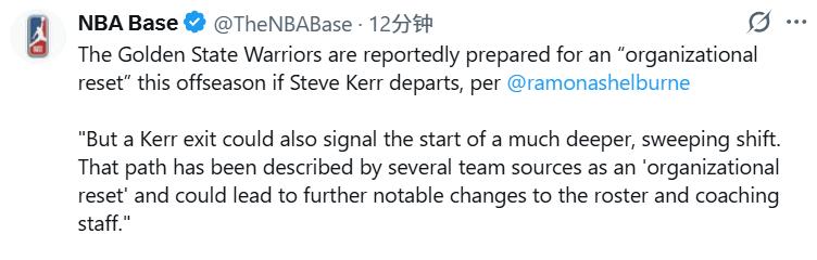 Simultaneously, Kerr's departure could also mean the Warriors undergo a comprehensive reset, triggering a larger-scale, broader-ranging transformation.Multiple internal team sources define this path as "a comprehensive organizational-level team restructuring," which likely will lead to significant reshuffling of the roster and coaching staff.