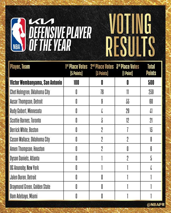 In a previous interview, Wembanyama confidently expressed: I would be surprised if I were not unanimously elected Defensive Player of the Year. This Spurs cornerstone not only consistently led the DPOY rankings but also redefined the level of dominance a defensive player can achieve.