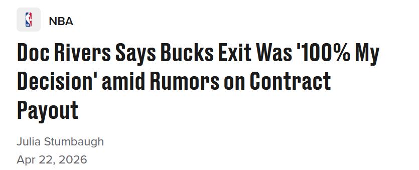 In the 2025-26 season, the Bucks only achieved a record of 32 wins and 50 losses, missing the playoffs, and the conflict between the team and Giannis Antetokounmpo also intensified publicly. Under this background, Rivers chose to leave.
