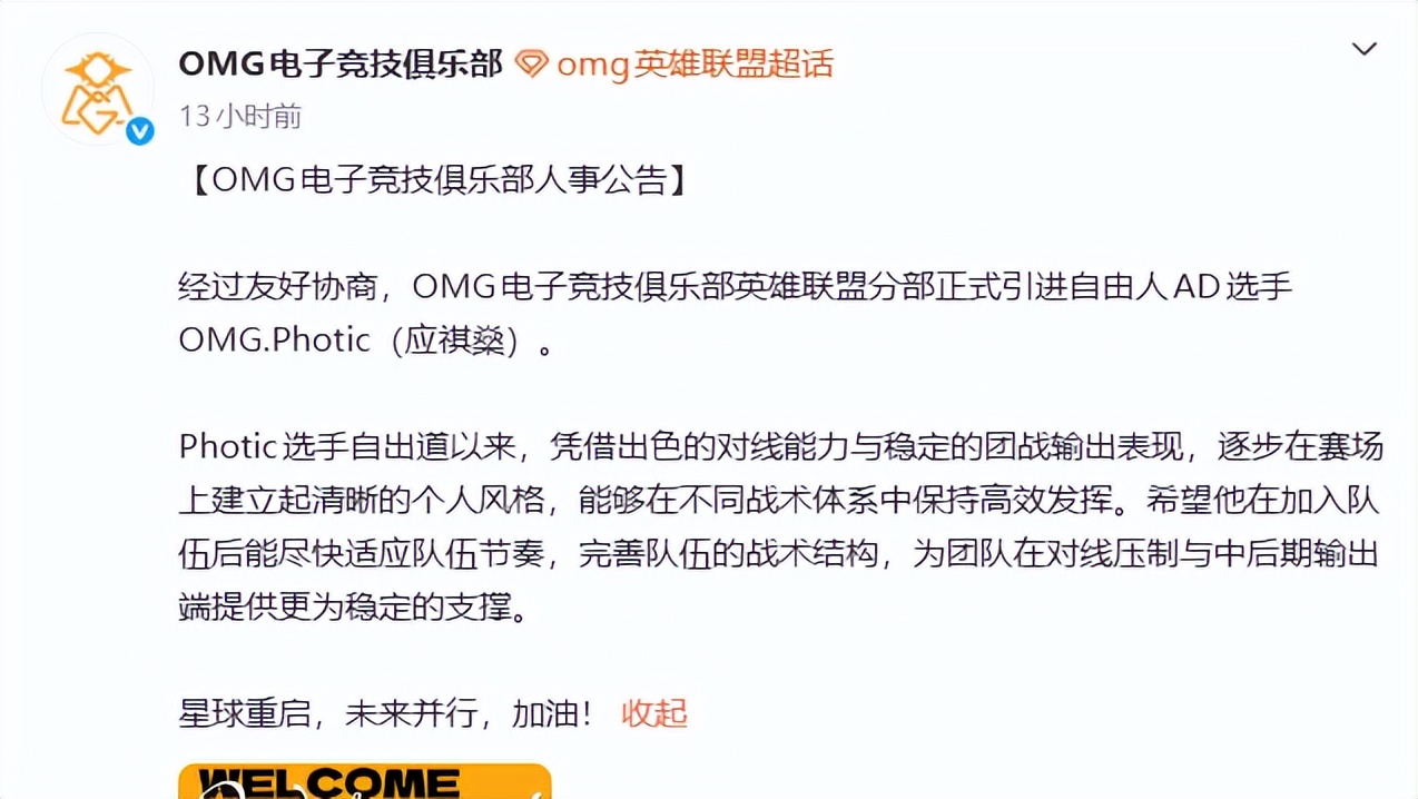 The OMG team in the Nirvana group has already suffered two consecutive losses in the new stage. With three matches left, if they continue to lose, OMG will start preparing for S17 half a year early. The club is currently trying to enhance the team's strength to retain hope for the third stage. After surveying the free agent market, OMG decided to sign AD player Photic, who played for IG in the first stage, to compete with "太子" for the starting position.