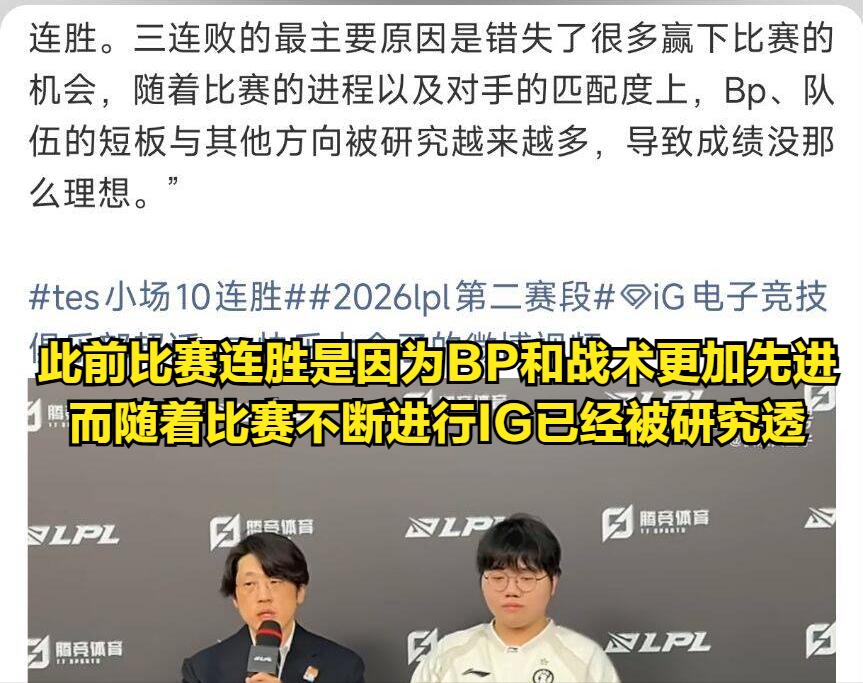 In the post-match interview, the IG coach罕见发火, stating the loss to TES was unacceptable due to too many mistakes and低迷状态. He explained the三连败原因: earlier wins came from superior版本理解, but as other teams improved and studied IG's weaknesses, results declined.
