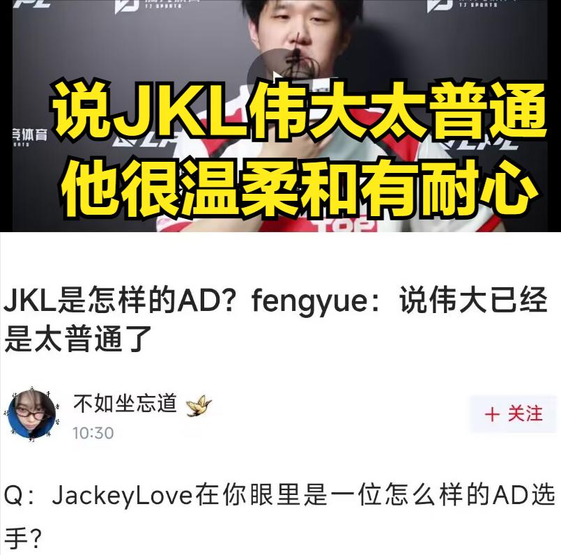 Following TES's连胜 streak, new support Feng Yue was interviewed. Asked about搭档 JKL, Feng Yue stated: "JKL is a top-tier LPL AD; it's an honor to lane with him." He added that calling JKL "great" is too普通; JKL is perfect in both life and competition, teaching him many技巧 during training with patience and gentleness, explaining until he understood.
