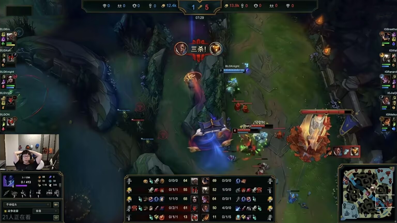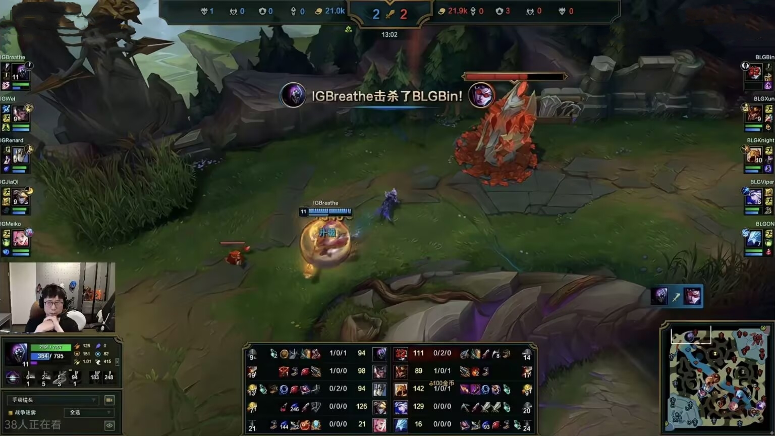 Bin was invisible for over 20 minutes, only becoming impactful after three items. At 28 minutes, BLG secured Baron. While pushing top lane, their mid and jungle were killed by IG. Four players chased the VN, but Bin turned around and showcased his skills. In a 1v4 situation, Bin first killed the jungler then the AD. Although he died eventually, it was a 1v4 counter-killing two. Bin's play here is definitely the most visually striking VN performance of the second phase.
