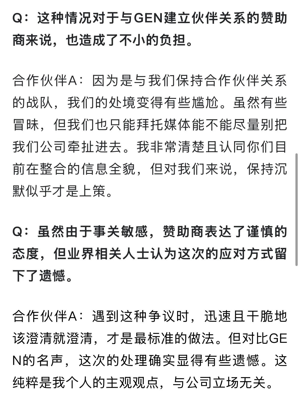 Recently, GEN's top management finally gave a clear response. The wording seemed to shift blame, even stating that the agency's early announcement missed the timing. According to investigation results, internal penalties will be imposed. They also mentioned that Ruler did not appear in the fan meeting on the 5th. This approach of protecting players and managing team image seems more like pursuing results, transferring pressure to other players and the newly appointed supervisor. Even some related sponsors of GEN expressed their views, hoping not to be implicated, giving a sense of silent distancing.