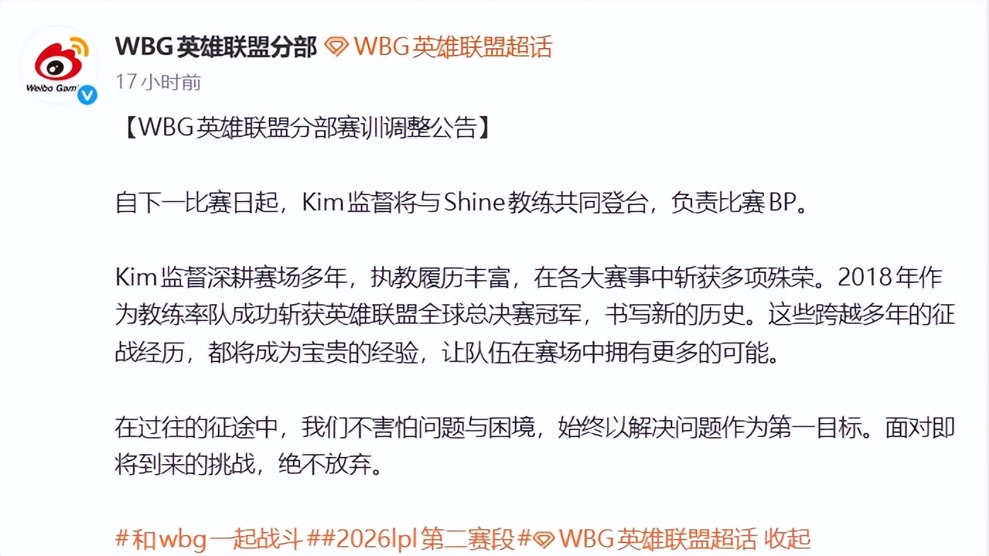 For WE vs. WBG,微博 made a small adjustment: from this match, team supervisor Kim will join coach Shine for on-stage BP. Changing赛训 seems微博's only viable change now. But the team's biggest issue isn't BP; if players are underperforming, even with strong picks, lane phase struggles.