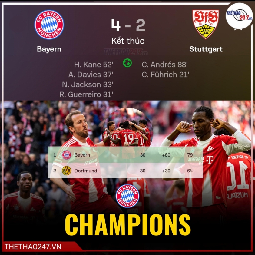 (Football result) - Bayern Munich wrapped up the championship chase in an unforgettable fashion, overturning the deficit to beat VfB Stuttgart 4-2 on their home ground, thus successfully retaining the throne and clinching their 34th Bundesliga title historically.