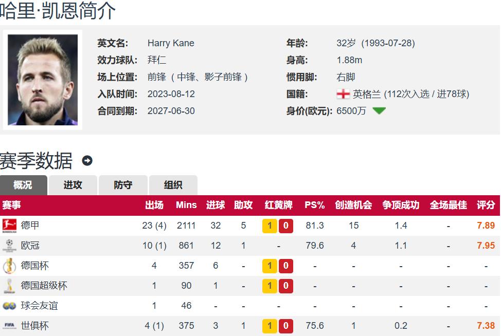 Kane is currently 32 years old, 1.88 meters tall, a right-footed center-forward who can also drop back as a second striker to organize attacks. His Transfermarkt value is €65 million. This Bundesliga season: 27 matches, 32 goals, 5 assists; Champions League: 11 matches, 12 goals, 1 assist; German Cup: 4 matches, 6 goals—truly Bayern's top-class offensive weapon. Bayern vs Paris will bring a top-tier showdown in the Champions League, with Kane chasing his first major European trophy.