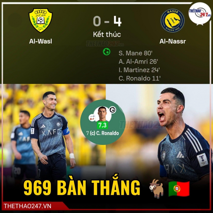 In the quarter-final match against Al Wasl at Zabeel Stadium (Dubai), Cristiano Ronaldo quickly made his mark by scoring the opening goal in the 11th minute. Utilizing Boushal's precise cross, the Portuguese superstar finished neatly, scoring his 970th career goal and moving closer to the historic milestone of 1,000 goals.